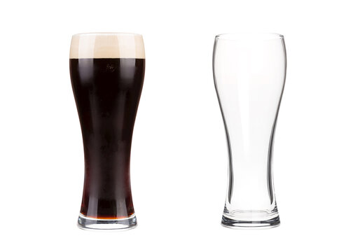 Two beer glasses isolated on white background. Mug filled with draft beer with bubbles and foam and an empty mug. Graphic design element for brewery ad, beer garden poster, flyers, printables.