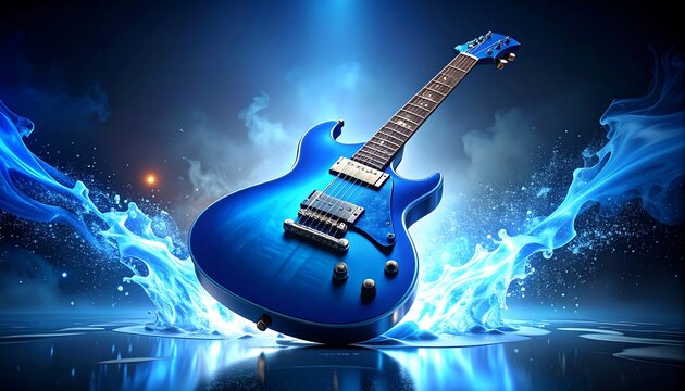 Blue electric guitar on a reflective surface with blue lights and splashes
