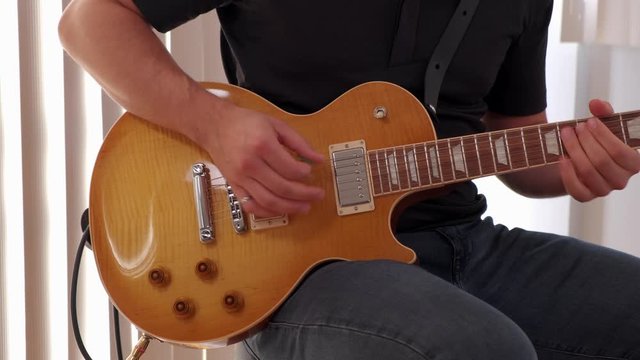 Close-up of caucasian male young adult playing electric guitar in studio.