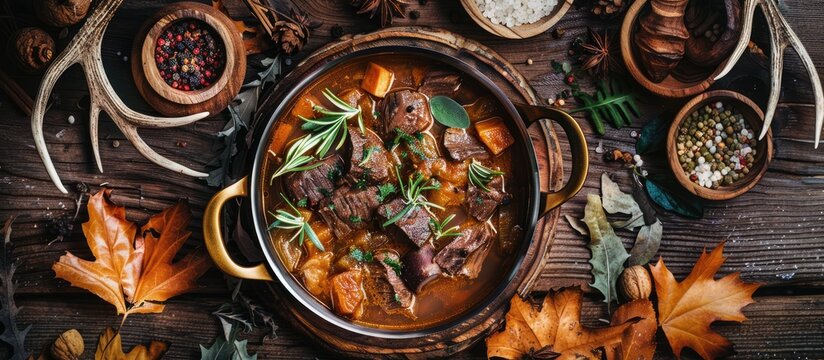 Hearty Venison Goulash Stew Cooked In A Copper Pot, Infused With Fresh Herbs, Adorned With Evergreen Sprigs And Deer Antlers.