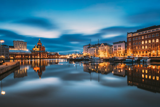 Helsinki, Finland. View Of Kanavaranta Street With Uspenski Cathedral And Pohjoisranta Street In Evening Night Illuminations