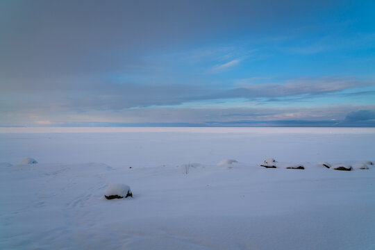 The coast of the Gulf of Finland in the Lower Park of the Peterhof State Museum-Reserve on a sunny winter day, St. Petersburg, Russia