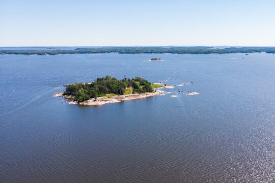 Aerial view of clean nordic nature. Beautiful rocks and island with woods in North Europe, Baltic sea, gulf of Finland.
