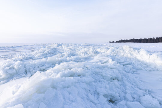 Russia, Saint Petersburg, Sestroretsk, Aerial view of frozen shore of Gulf of Finland