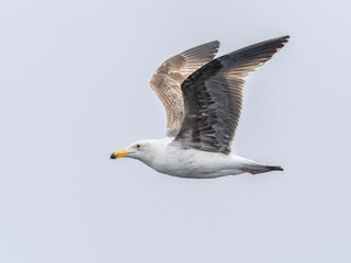 Juvenile California gull (Larus californicus), in flight in Monterey Bay Marine Sanctuary, Monterey