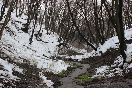 A stream in a gully overgrown with trees, the slopes of which are covered with snow