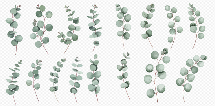 Dry branches adorned with gum tree leaves Botanical illustration featuring park garden or forest vegetation in the backdrop Watercolor artwork isolated on a white background Hand drawn design eleme
