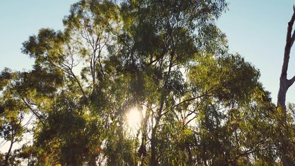 Slow motion panning shot looking up at an Australian Gum tree with sunlight shining through the green leaves and blue sky in the background.