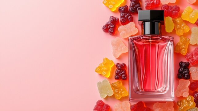 A bottle of perfume surrounded by gummy bears on a pink background. Concept of sweet, fruity fragrance.