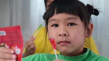 Two happy cute little girls eating lollipops. Funny kid with lollipop candy. Child eating sweets.
