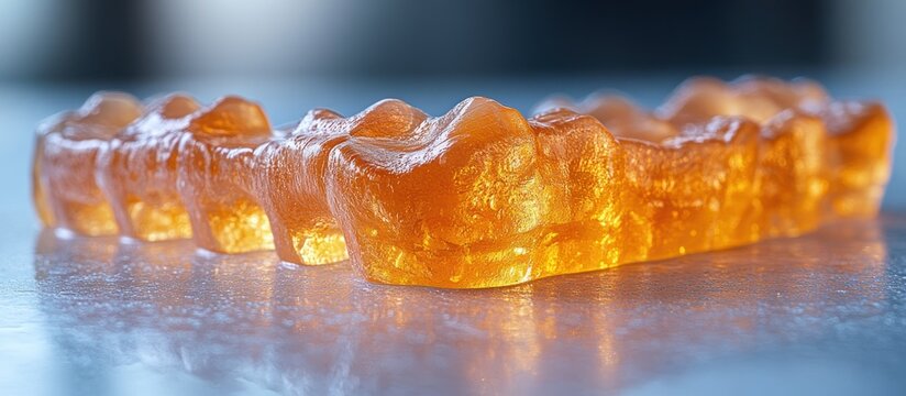A translucent orange gummy candy shaped like teeth, placed on a reflective surface.