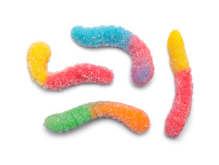 Top view of three sugar coated sour tasting colorful gummy worms isolated on a white background.