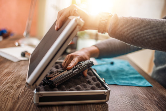 Gun law concept. Hand gun weapon and judges gavel. Crime background