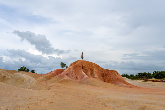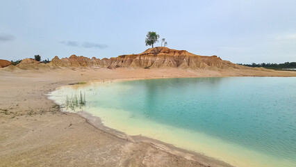 Iconic Bintan Mini Desert (Gurun Pasir Bintan) on Bintan Island, Riau, Indonesia. Lone tree stands atop small hill surrounded by a turquoise lake. Picturesque hilly sand dunes. Travel destination Asia