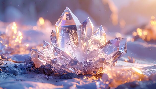 Glowing crystal cluster shines brightly on sandy surface at sunset with warm lighting effects
