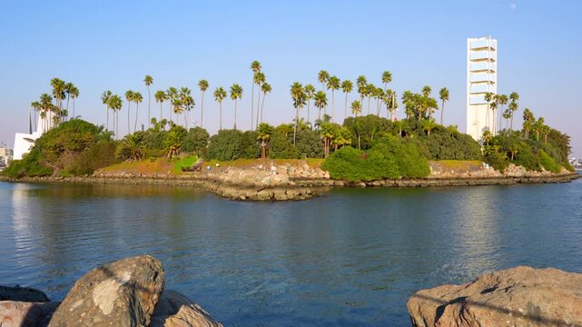 Long Beach, California - January 11, 2025: Picturesque shot capturing Island Grissom, featuring tall palm trees and clear waters, viewed from a rocky shoreline during golden hour lighting.