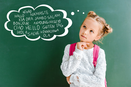 pensive kid standing with backpack near chalkboard with greetings lettering on green