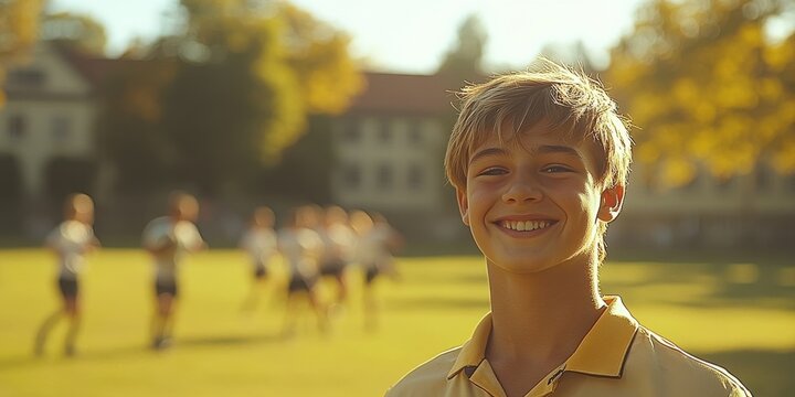 middle school student, blurred grassy schoolyard with classmates playing rugby