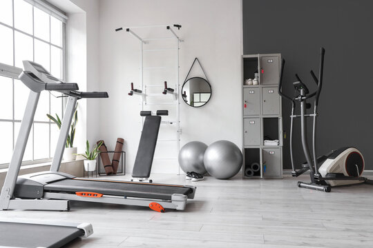 Interior of gym with modern sports equipment