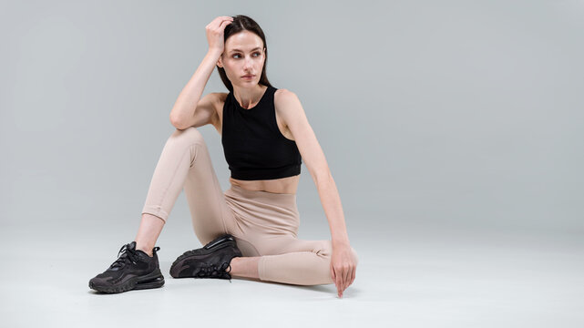 Modern concrete yoga gym interior with equipment, empty billboard on wall, daylight and wooden flooring. Healthy lifestyle concept. Mock up