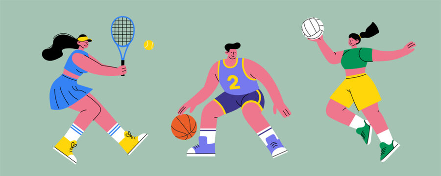 Team sports players set. Flat illustration of tennis, basketball, and volleyball athletes in action. Perfect for fitness blogs, sport posters, gym promotions, and educational materials.