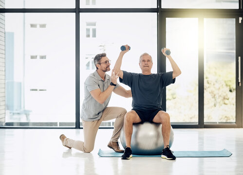 Healthcare, physiotherapy and old man with dumbbells, gym ball and rehabilitation in senior care. Physiotherapist, consultant and elderly patient in mobility training, exercise and help in retirement