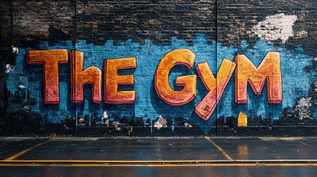 A large mural featuring the words The Gym in bold and colorful letters adorns a brick wall in an urban area. The wet pavement reflects the bright colors, enhancing the lively atmosphere