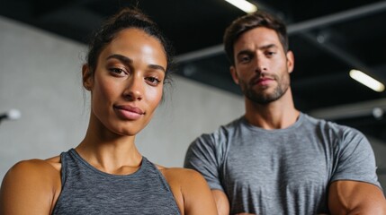 Focused athletic couple takes a moment to steady their breathing after an intense training session together at the gym