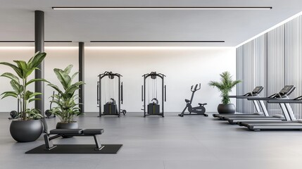 Modern gym interior with exercise equipment and spacious layout for fitness activities.
