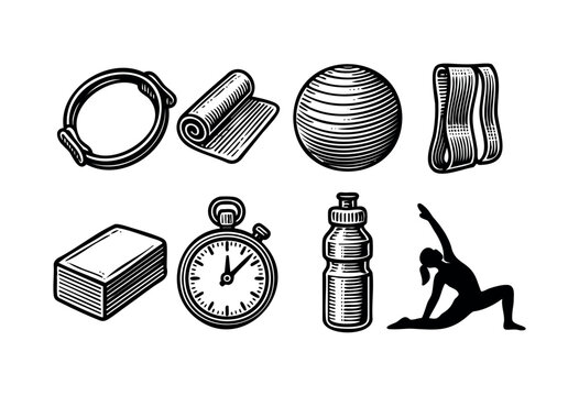 A set of fitness essentials including a mat, ball, block, resistance bands, water bottle, timer, and yoga pose are showcased in a woodcut style — stock vector.