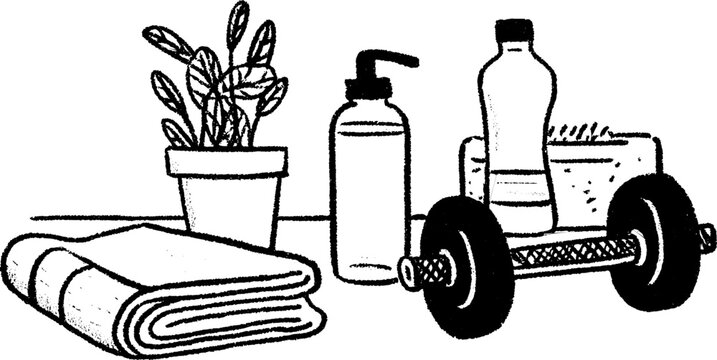 Healthy lifestyle essentials featuring plant, banana, apple, weights, yoga mat and water bottle, promoting fitness and wellbeing for a balanced routine