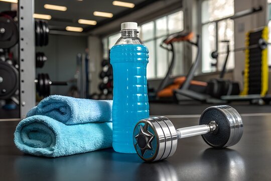 Hydration and strength training essentials a blue drink towels and dumbbell in a gym setting