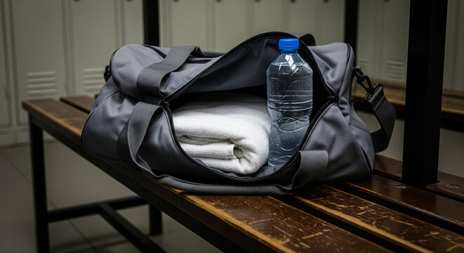 An open gray gym bag sits on a wooden bench in a locker room, revealing a neatly folded white towel and a clear bottle of water. This image perfectly captures the essentials for a workout