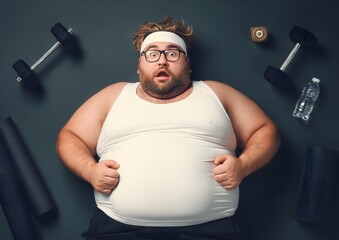 Funny overweight man working out in the gym