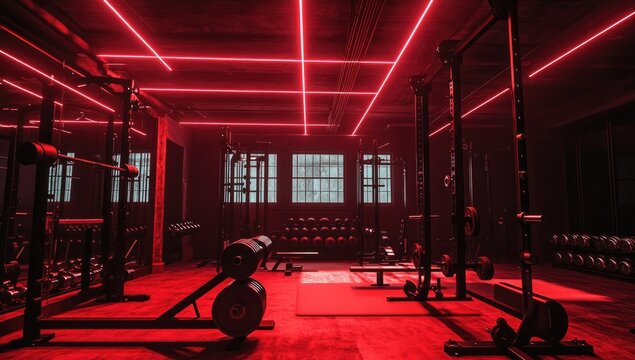 gym with high-tech equipment and neon lights, representing the future of fitness in a home setting