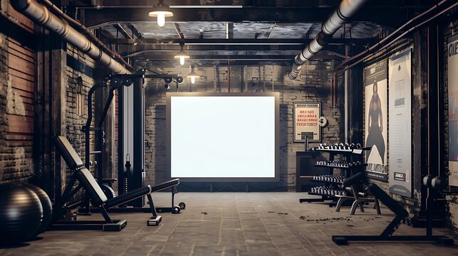 Blank portrait billboard set in a gym underground, flanked by fitness machines and motivational art.