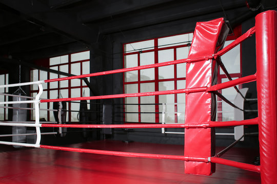 Indoor boxing gym showcases ring with red ropes, punching bags, training equipment, under high ceilings and bright lighting fixtures