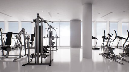 gym interior and fitness equipment, healthy lifestyle concept, video 3d render animation