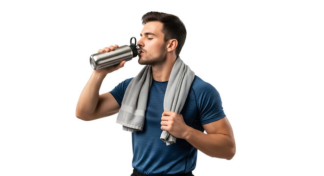 A man drinking from a metal bottle with a towel around his neck after gym video 4k