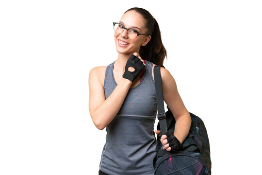 Young sport woman with sport bag over isolated background with glasses and smiling