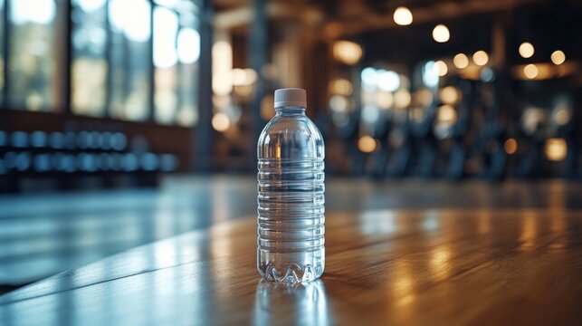 Clear Water Bottle Placed on Table in Gym Setting. Generative AI