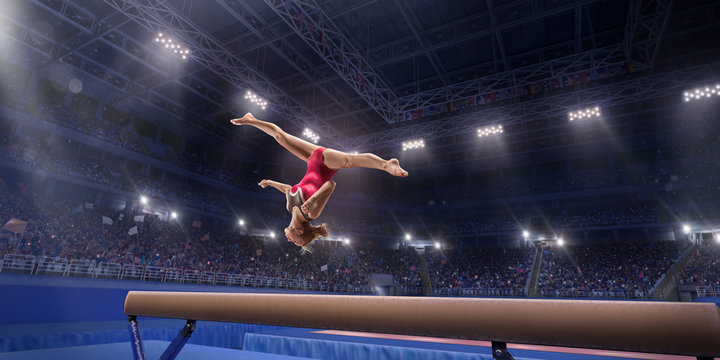 Female athlete doing a complicated exciting trick on gymnastics balance beam in a professional gym. Girl perform stunt in bright sports clothes