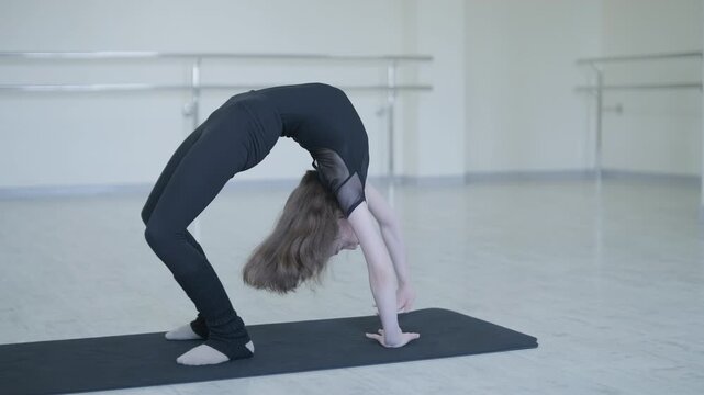 Child gymnast picks up a foot in the splits. Children's sports. flexibility and stretching. Slow motion