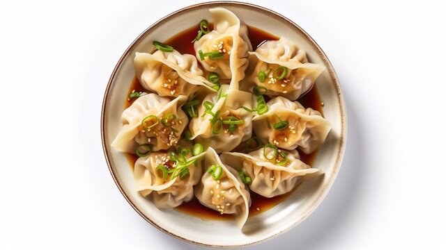 Traditional japaneese gyoza dumplings with  chopped green onions and sesame seeds in ceramic plate on wooden table. Top view. AI generated