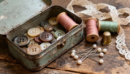 Vintage sewing box with buttons, thread spools, lace, and pins on rustic wood