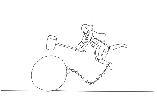 Drawing of businesswoman smash chain steel ball with hammer. Concept of break free. One line style art