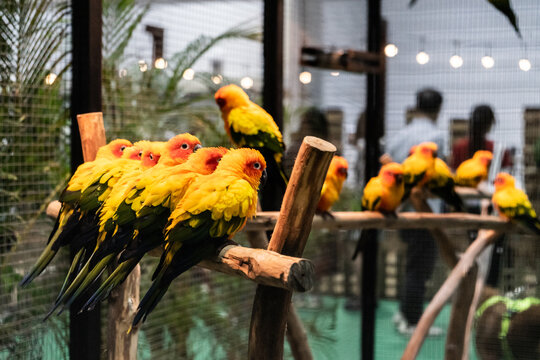 Colorful parrots in tropical aviary urban zoo wildlife photography indoor habitat close-up view nature conservation awareness