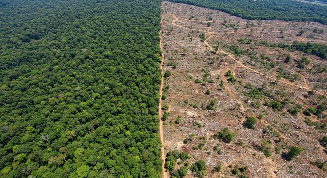 Aerial view of deforestation's severe environmental impact, showing green forest meeting barren land, symbolizing habitat loss and ecological destruction