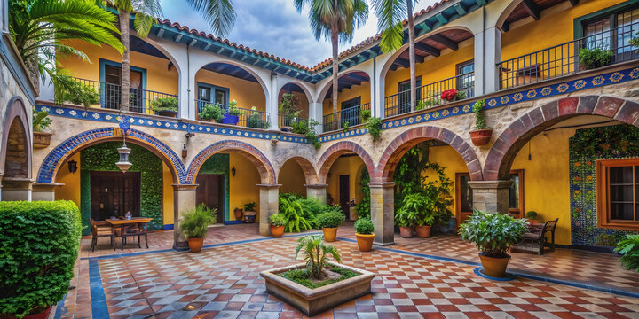 Colonial Mexican hacienda courtyard with traditional architecture, colorful tiles, and lush vegetation, Mexican