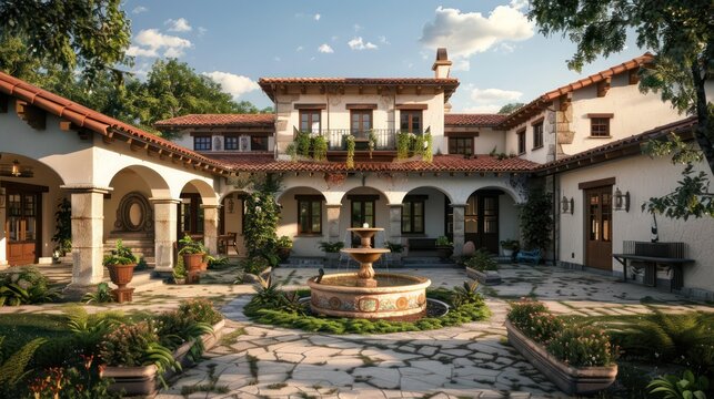 suburban farmhouse with a focus on Spanish hacienda style, featuring a stucco exterior, red tile roof, and an open courtyard with a fountain